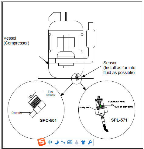 小樣品粘度計安裝需按照傳感器尺寸,在壓縮機上鉆孔并開孔,用來裝傳感器,如果使用可選的1/2NPT美制適配器,用生膠帶纏繞螺距和螺紋部分,這部分將傳感器裝到壓縮機上,在傳感器底部的o形環槽地方裝上O型環,將傳感器裝到開的螺紋孔或適配器上。