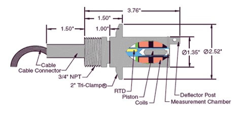位于活塞上方的導流裝置,將液體導入測量室,活塞持續運動以不斷更新樣品,同時機械摩擦不斷擦洗測量室。 一個內置的RTD溫度測量探頭,實時測量測量室的溫度。