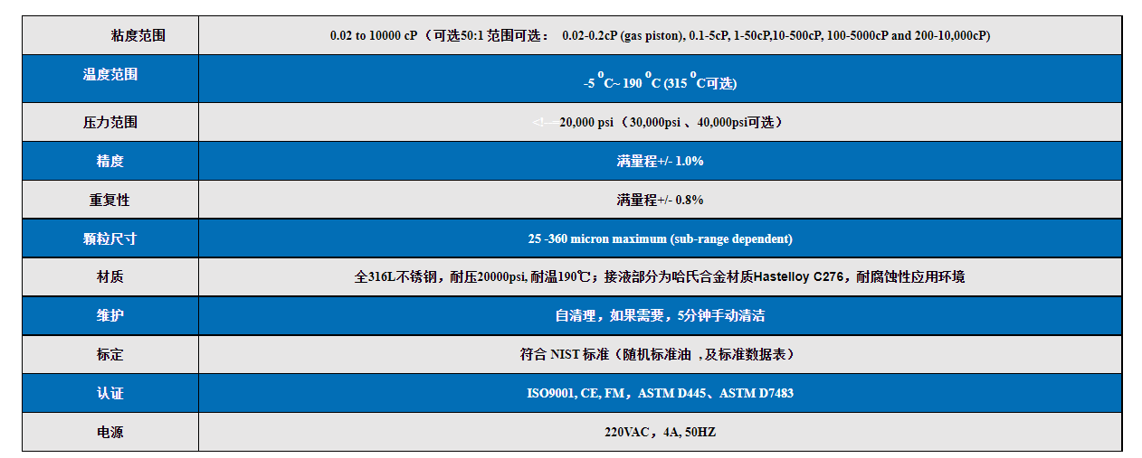 1.高溫高壓粘度計(jì)(VISCOlab PVT+):劍橋粘度公司的ViscoLab PVT+(壓力-體積-溫度)是在高溫和高壓下測定粘度的全球?qū)嶒?yàn)室標(biāo)準(zhǔn)。ViscoLab PVT+高壓粘度計(jì)設(shè)計(jì)用于儲(chǔ)層流體分析、相態(tài)行為、超臨界流體和其他研發(fā)應(yīng)用中的粘度和溫度測試。
